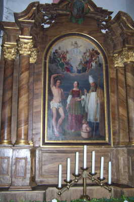 Der Agatha-Altar auf der linken Seite zeigt den Hl.Sebastian, die Hl.Agatha und den Hl.Nikolaus; die Patrone gegen ansteckende Krankheiten , Feuersbrunst und Wassernot;darüber die 14 Hl.Nothelfer